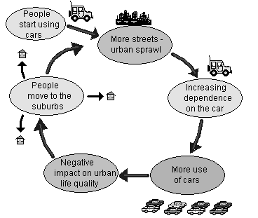 spaces. This urban sprawl accelerates in a spiral fashion.